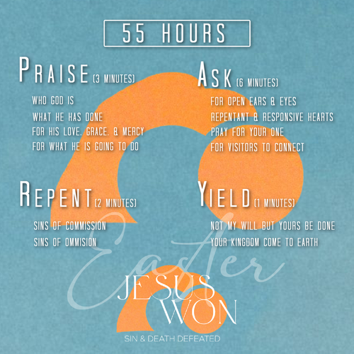 We are praying as a church for 55 hours straight beginning at 12:00 a.m. on Good Friday and ending at 7:00 a.m. on Easter Sunday. Sign up for a 15 minute time slot to pray from wherever you are at for our Easter service. Below is a prayer guide to help lead you through your time of prayer.